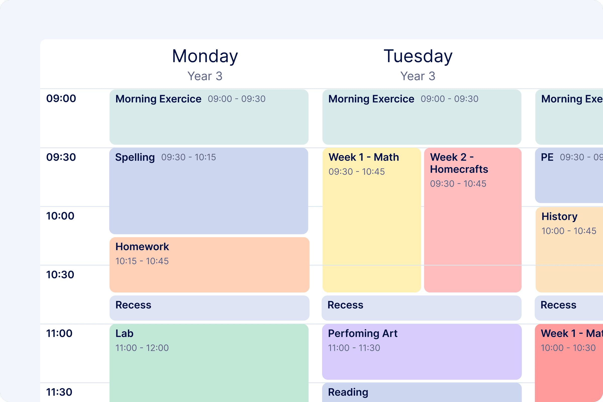 Define time slots, subjects, and key moments of the day in just a few clicks with our Timetable tool. Your framework is ready for your lessons!