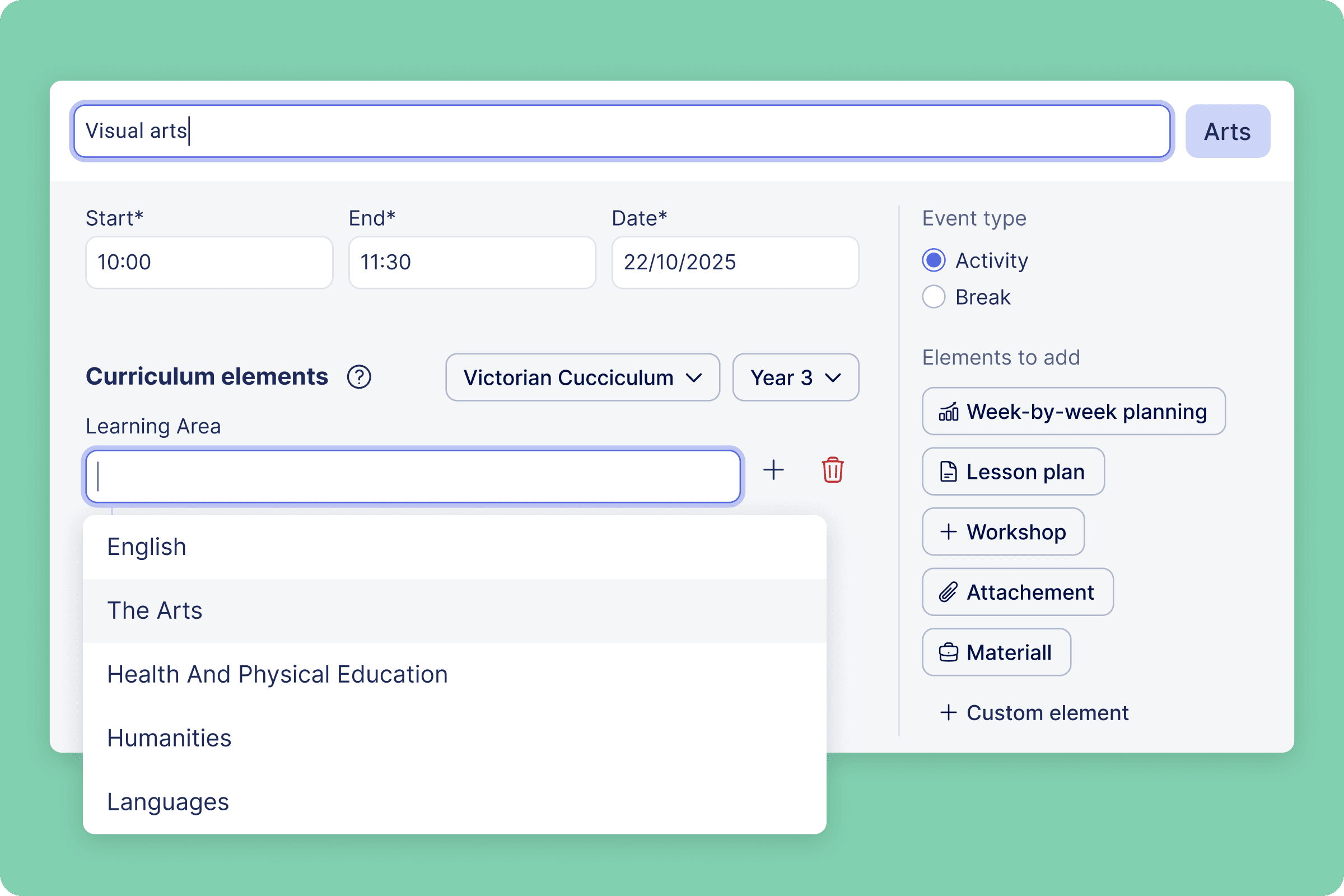 Connect curriculum outcomes, set your learning goals, add descriptions, lesson steps, or workshop activities. Import existing lesson plans too.