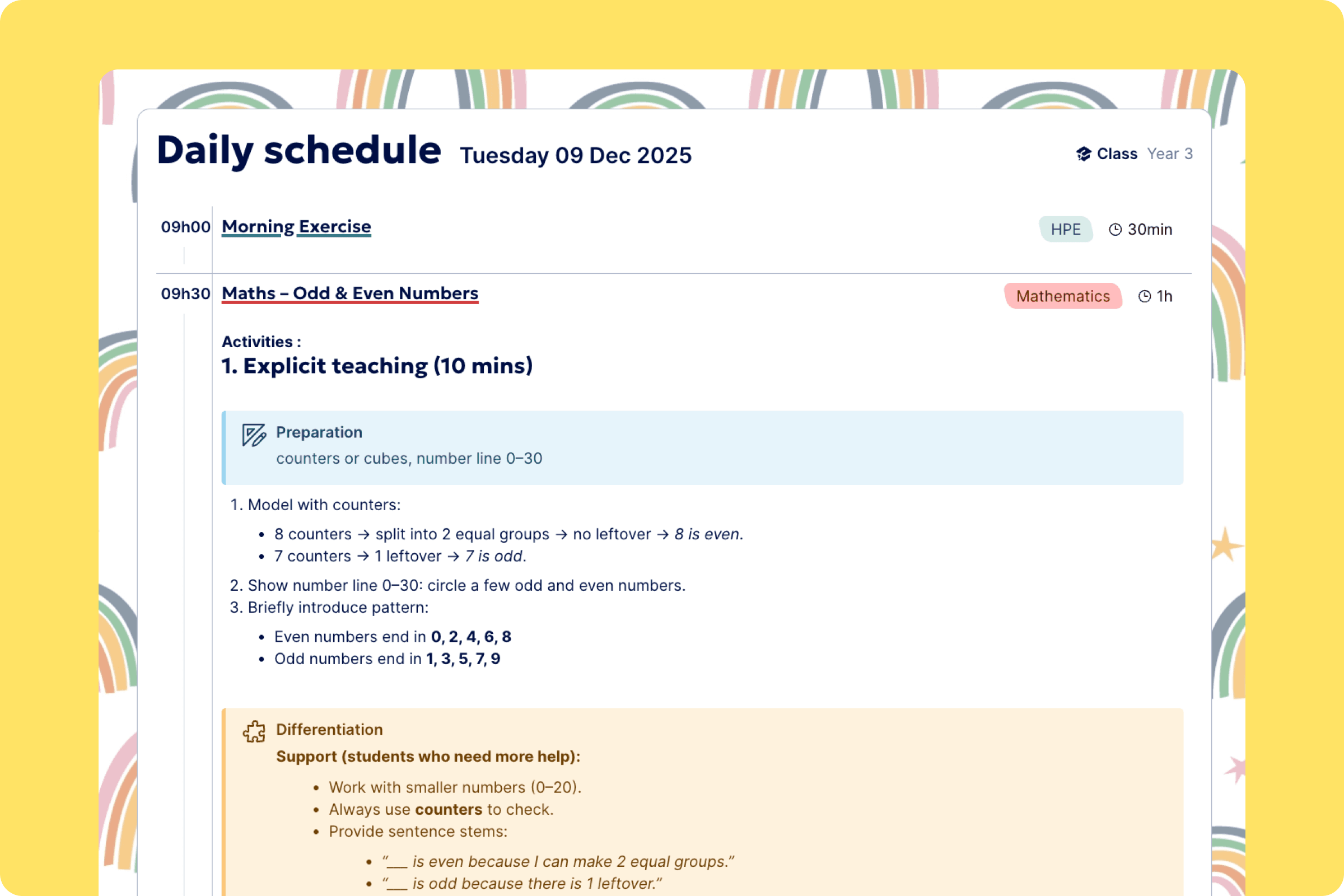 Single year, double, or triple composite? Teetsh lets you differentiate your lessons, assign specific learning outcomes to each year level, and organise your daily planner with complete clarity.