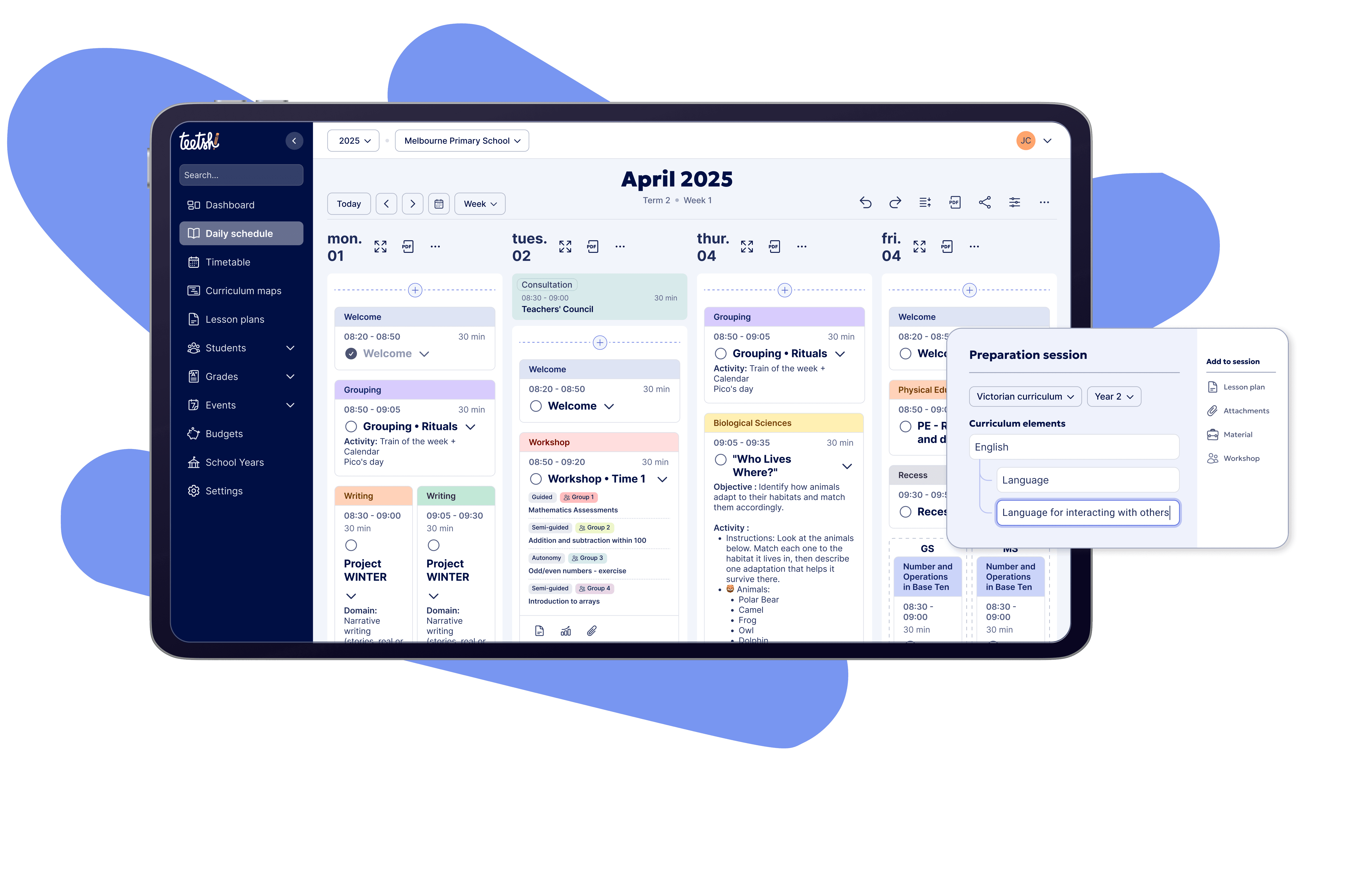 Every teacher has their own habits and needs. Permanent, early years, relief, or specialist support? Teetsh adapts to your practice. Organise your days however you want, with a tool that's simple, clear, and fully customisable.
