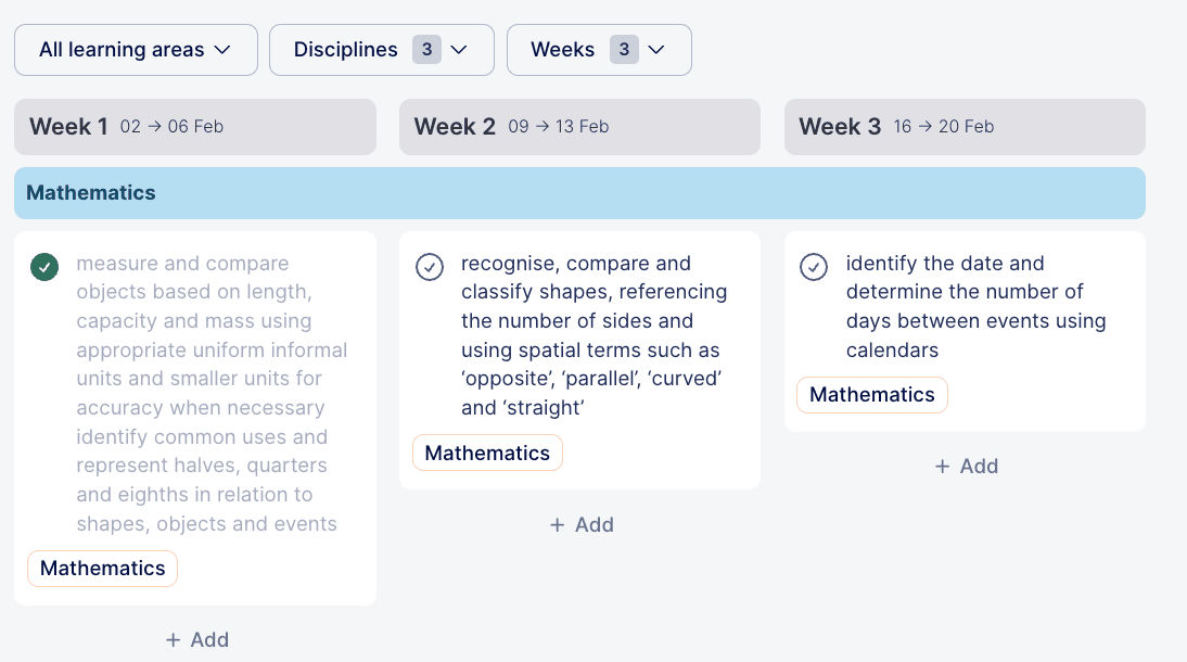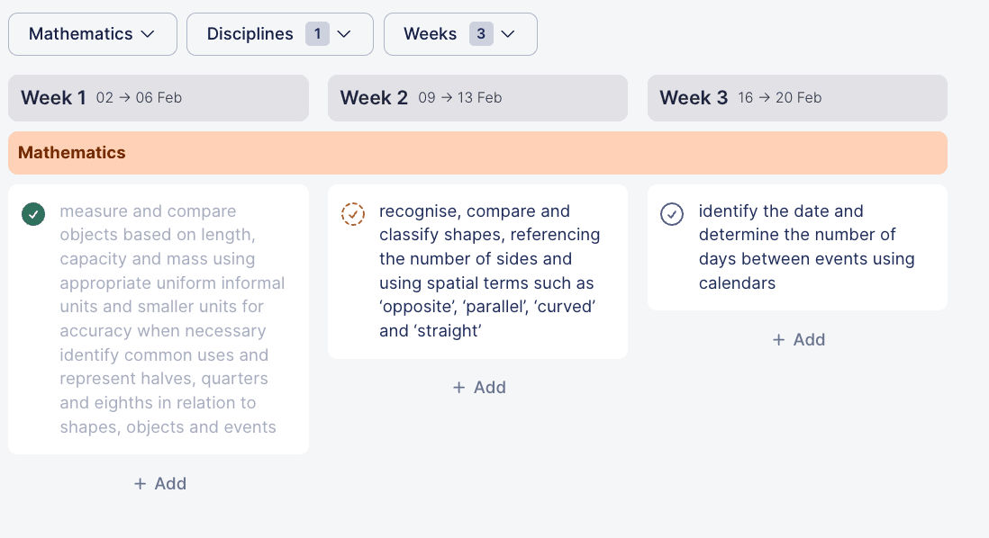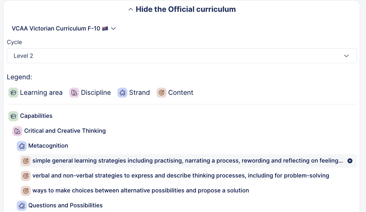 Easily reference the Australian Curriculum content descriptions and achievement standards. Multiple state curriculum are available: