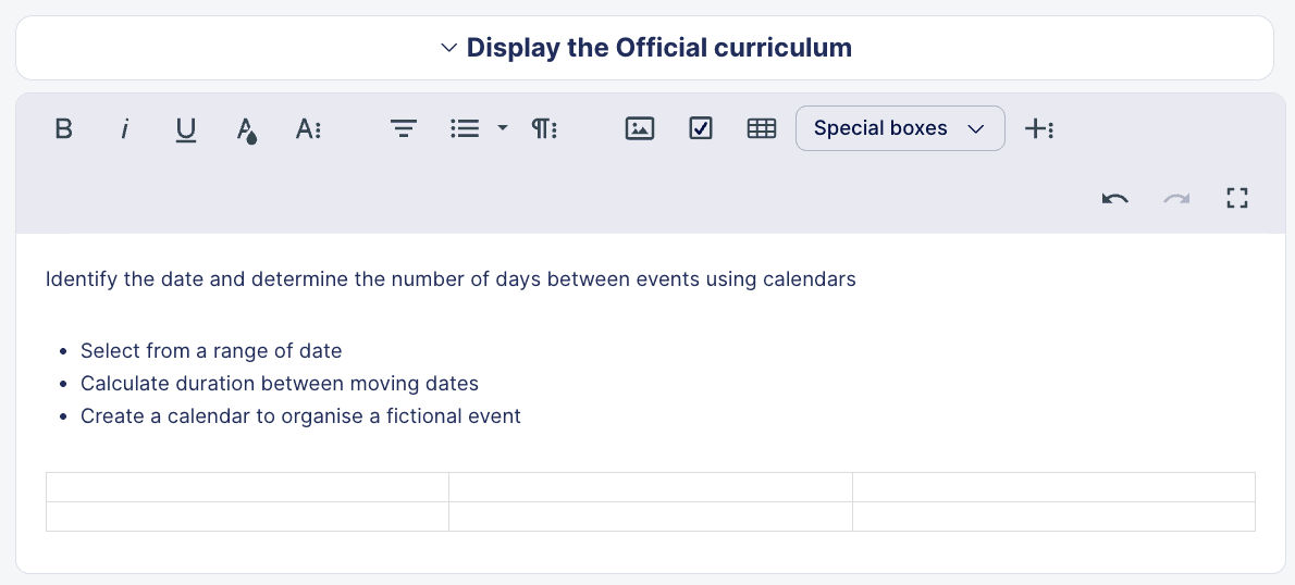 The text editor lets you bring your scope and sequence to life. Add colours, tables, checkboxes, images...